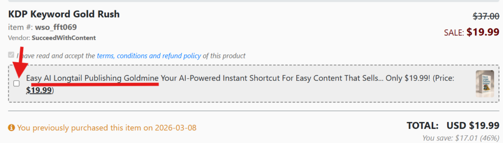 You’ll notice an “order bump” when you go to check out. This is a chance to include Amy course + custom GPT’s, called Easy AI Longtail Publishing Goldmine. Where KDP Gold Rush guides you on keywords to use for ensuring your books visibility, Easy AI Longtail Publishing Goldmine lets you use longtail keyword research to identify topics to write about and how to produce related books in a series. You’ll see it offered right below the terms and conditions line, and it’s the perfect complementary product.